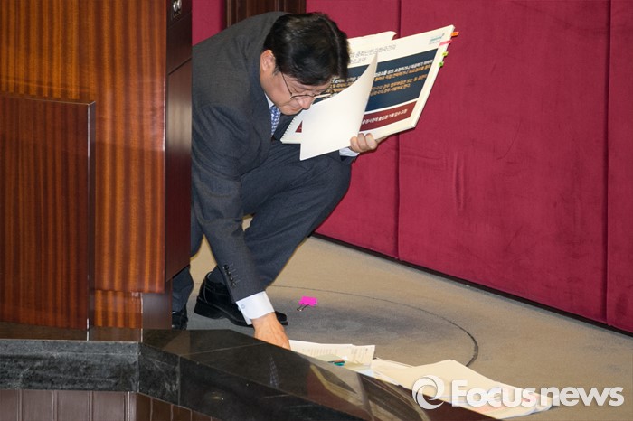 (서울=포커스뉴스) 테러방지법 직권상정에 반발해 야당이 무제한 토론(필리버스터)를 일주일째 진행하며 약 140시간을 돌파한 29일 오후 서울 여의도 국회 본회의장에서 토론에 참여한 홍익표 더불어민주당 의원이 자료를 정리하고 있다.