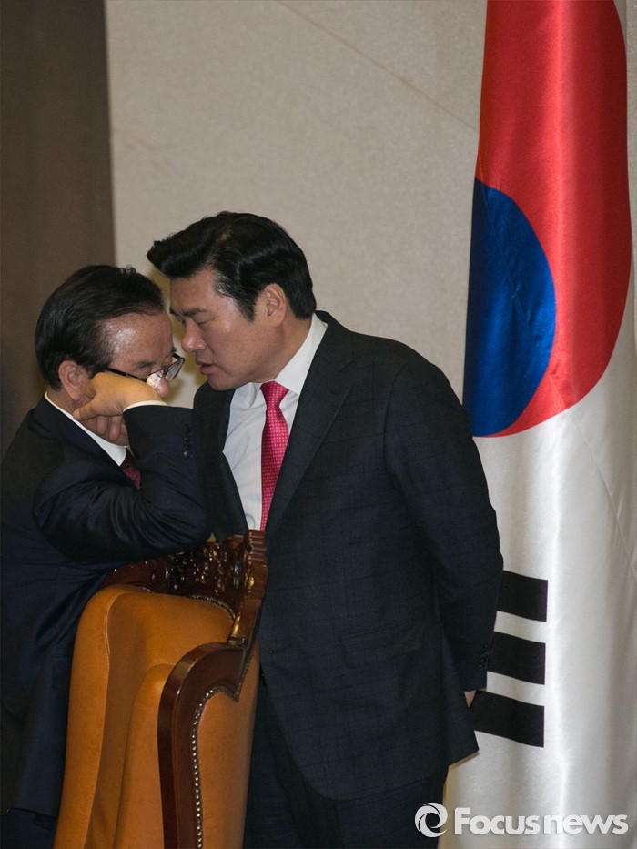 (서울=포커스뉴스) 테러방지법 직권상정에 반발해 야당이 무제한 토론(필리버스터)를 일주일째 진행하며 약 140시간을 돌파한 29일 오후 서울 여의도 국회 본회의장에서 정갑윤(왼쪽) 국회 부의장과 원유철 새누리당 원내대표가 대화하고 있다.