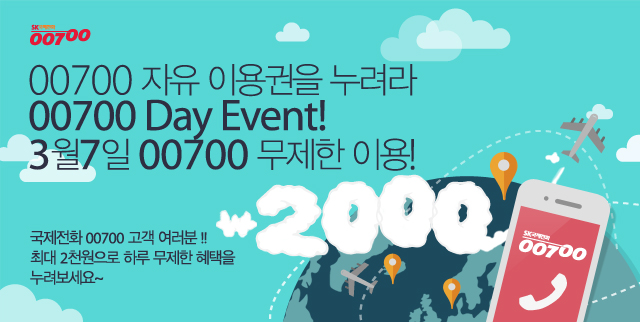 이번 이벤트는 2월29일부터 6일까지 00700 홈페이지를 통해 응모한 무선 번호로 참여할 수 있으며, 7일 당일 사전 등록된 번호로 국제전화 이용시 대상 국가나 통화량에 상관없이 최대 2000원만 청구된다.(위성통화 및 일부 요금제 고객 제외)