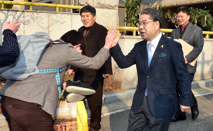 (서울=포커스뉴스) 2일 오전 경기도 안산 단원고등학교에서 교육 현장방문을 마친 이재정 경기도교육감이 학생들과 인사를 하고 있다. <사진제공=경기도교육청>