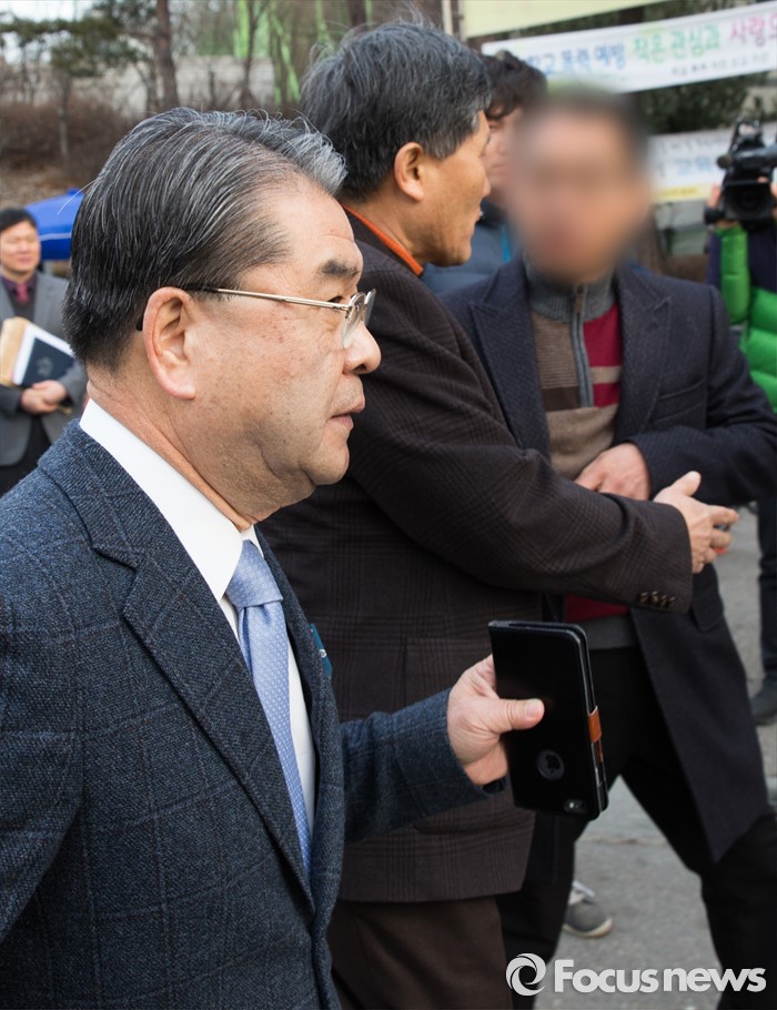 (안산=포커스뉴스) 안산 단원고등학교 개학일인 2일 오전 경기도 안산 단원고등학교에 방문한 이재정(왼쪽) 경기도교육감이 한 신입생 학부모에게 항의 받고 있다.