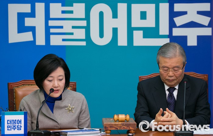 (서울=포커스뉴스) 김종인(오른쪽) 더불어민주당 비대위 대표가 2일 오전 서울 여의도 국회에서 열린 비상대책위원회의에 참석해 박영선 비대위원의 발언을 듣고 있다.