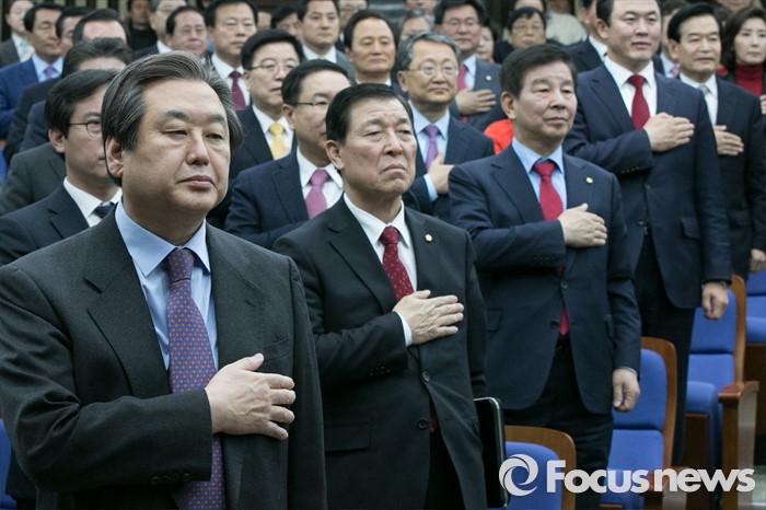 (서울=포커스뉴스) 김무성(앞) 새누리당 대표를 비롯한 의원들이 2일 오전 서울 여의도 국회에서 열린 의원총회에 참석해 국민의례를 하고 있다.