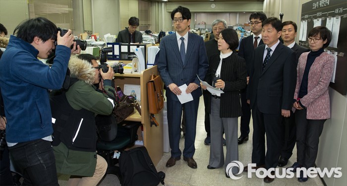 (서울=포커스뉴스) 2일 오전 서울 서초구 중앙지방법원 기자실에서 위은진(앞줄 왼쪽 두번째) 대한변호사협회 인권위원회 부위원장이 테러방지법안 의견서 사태에 관한 입장을 발표하고 있다.