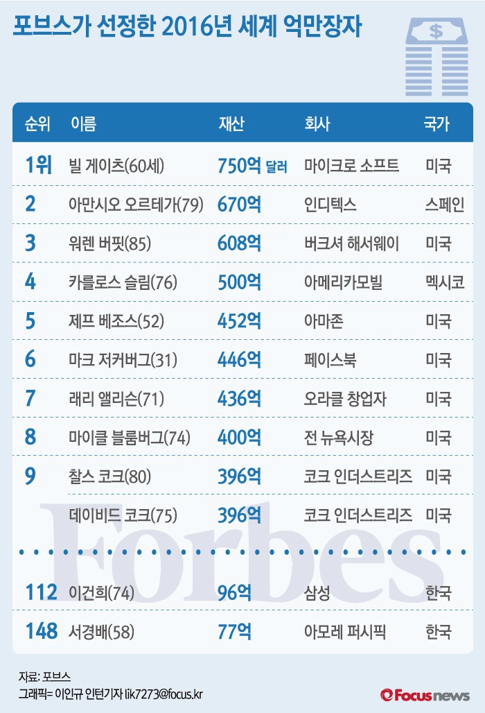 (서울=포커스뉴스) 미국 경제전문지 포브스가 1일(현지시간) '2016년 세계 억만장자’를 발표했다. 1위는 750억 달러(약 92조7375억 원)로 미국 마이크로소프트(MS) 공동창업자 빌 게이츠가 차지했다. 2위는 패션 브랜드 자라(Zara) 창업주 아만시오 오르테가, 3위는 워렌 버핏 버크셔 헤서웨이가 올랐다.
