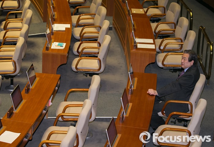 (서울=포커스뉴스) 테러방지법 직권상정에 반발해 야당이 세계 최장 기록의 필리버스터(무제한 토론)를 이어가고 있는 2일 오전 서울 여의도 국회 본회의장에서 김무성 새누리당 대표가 이종걸 더불어민주당 원내대표의 토론을 지켜보고 있다. 야당은 이날 필리버스터를 중단하고 선거법 등을 처리할 예정이다.