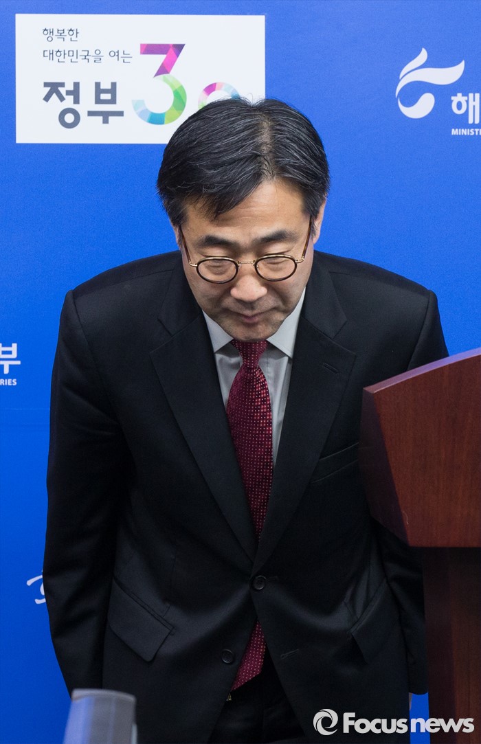 (세종=포커스뉴스) 2일 오전 세종시 정부세종청사 해양수산부 기자실에서 박광열 해수부 해사안전국장이 해양사고 예방을 위한 다각적 안전대책을 포함한 범정부 해사안전 종합계획을 발표에 앞서 인사하고 있다.