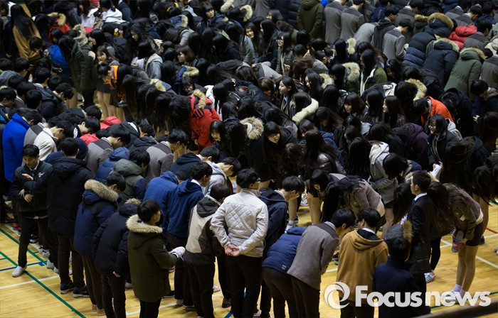 자안산=포커스뉴스) 2일 오전 경기도 안산시 단원구 올림픽기념관에서 열린 단원고등학교 입학식에 참석한 신입생들이 재학생들과 인사하고 있다.
