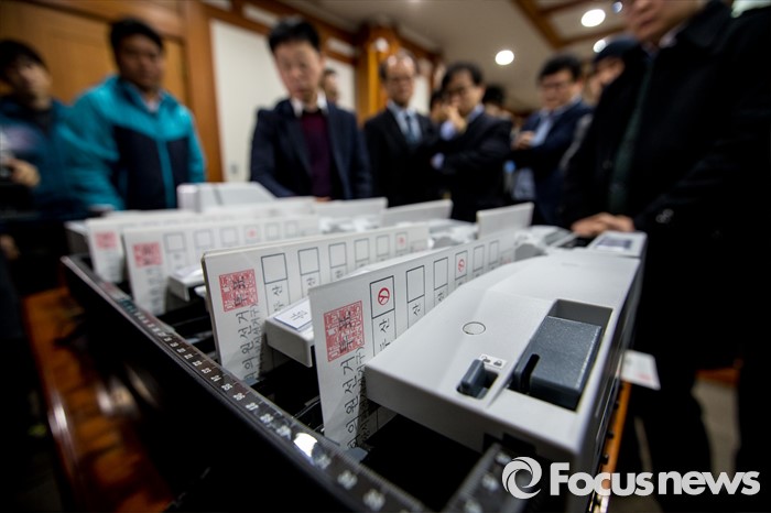 (과천=포커스뉴스) 2일 오전 경기도 과천시 중앙선거관리위원회에서 열린 '투표지분류기 및 선상투표 쉴드팩스 시연'에서 중앙선관위 직원이 투표지분류기 시연을 하고 있다.