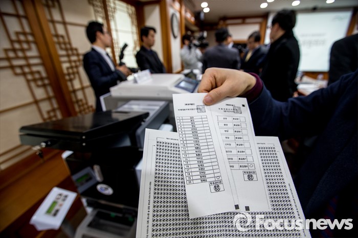 (과천=포커스뉴스) 2일 오전 경기도 과천시 중앙선거관리위원회에서 열린 '투표지분류기 및 선상투표 쉴드팩스 시연'에서 중앙선관위 직원이 선상투표에 사용될 투표용지를 견본을 선보이고 있다.
