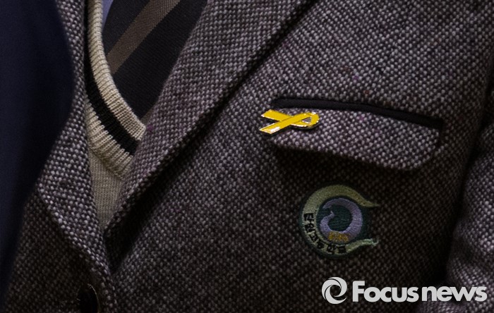 (안산=포커스뉴스) 2일 오전 경기도 안산시 단원구 올림픽기념관에서 열린 단원고등학교 입학식에 참석한 한 신입생의 교복에 노란 리본이 달려 있다.