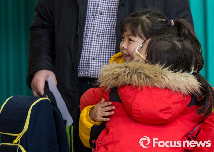 (서울=포커스뉴스) 2일 오전 서울 이태원 초등학교에서 열린 2016학년도 입학식에 참석한 신입생들이 포옹하고 있다.