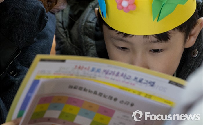 (서울=포커스뉴스) 2일 오전 서울 이태원 초등학교에서 열린 2016학년도 입학식에 참석한 신입생이 학교 안내 자료를 읽고 있다.