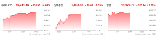 (서울=포커스뉴스) 아시아증시가 2일 모두 2~4%의 상승을 기록하는 등 견조한 흐름을 보이고 있다. 국제유가가 급등하고 미국 경제지표가 호조를 보이면서 아시아증시에 긍정적인 영향을 끼친 것으로 보인다.