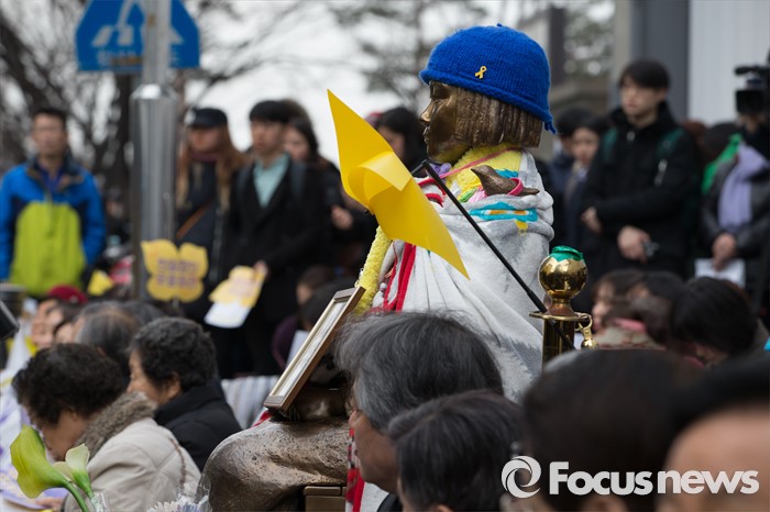 (서울=포커스뉴스) 2일 오후 서울 종로구 옛 주한일본대사관 앞에서 한국정신대문제대책협의회, 학생들을 비롯한 참석자들이 '제1220차 일본군 위안부 문제해결을 위한 정기 수요시위'를 하고 있다.