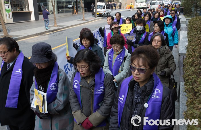 (서울=포커스뉴스) 2일 오후 서울 종로구 옛 주한일본대사관 앞에서 열린 '제1220차 일본군 위안부 문제해결을 위한 정기 수요시위'를 마친 한국기독교교회협의회 회원들을 비롯한 참가자들이 행진을 하고 있다.
