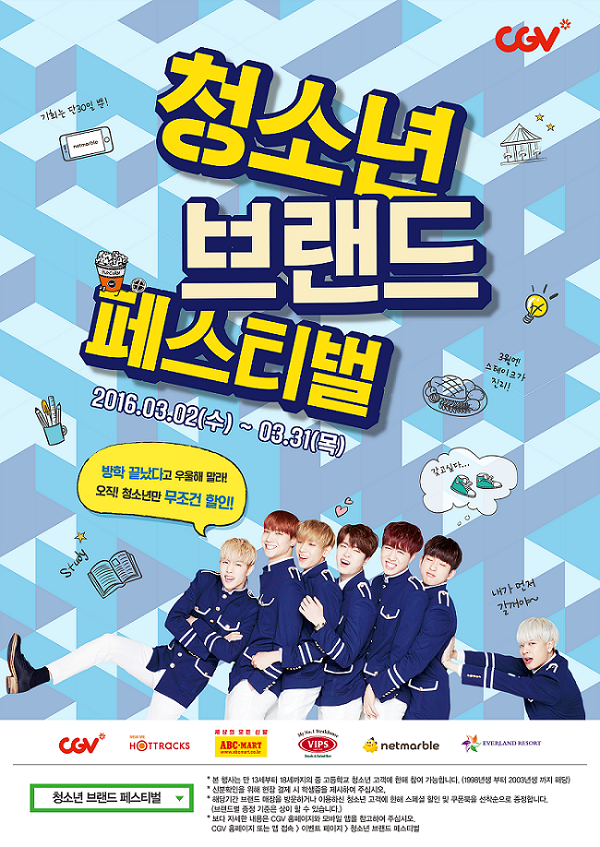 한편, '청소년 브랜드 페스티벌'의 모델로는 21일 컴백하는 인기 아이돌 GOT7(갓세븐)이 참여할 예정이다. 갓세븐은 추후 CGV와 함께 다양한 청소년 이벤트에도 동참한다.CGV는 오는 31일까지 청소년들이 좋아하는 다양한 브랜드의 할인 혜택을 모은 '청소년 브랜드 페스티벌'을 진행한다.<사진제공=CGV>