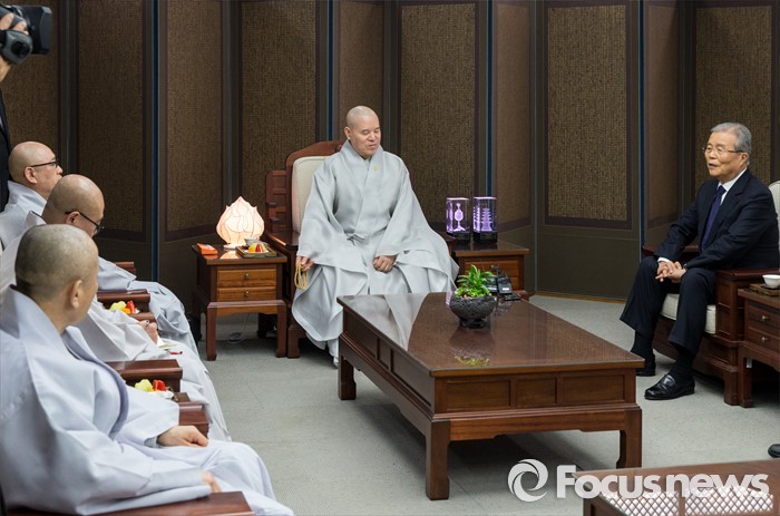 (서울=포커스뉴스) 2일 오후 서울 종로구 조계사를 찾은 김종인(맨 오른쪽) 더불어민주당 비상대책위원회 대표가 조계종 총무원장 자승 스님을 만나 대화하고 있다.