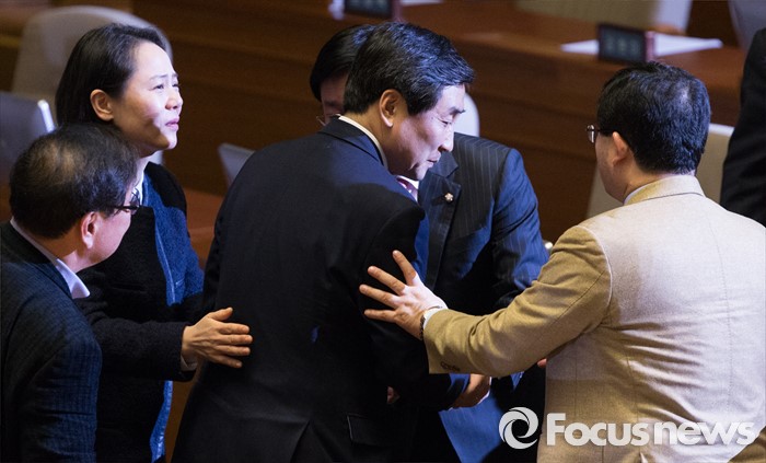 (서울=포커스뉴스) 테러방지법 직권상정에 반발해 야당이 세계 최장 기록의 필리버스터(무제한 토론)를 진행한 2일 오후 서울 여의도 국회 본회의장에서 마지막 주자인 이종걸 더불어민주당 원내대표가 토론을 마친 뒤 동료 의원들의 격려를 받으며 퇴장하고 있다. 마지막 주자로 나선 이 원내대표는 이날 정청래 의원의 기록인 11시간 40분을 경신한 12시간 31분을 기록하며 토론을 마쳤으며, 야당의 필리버스터는 약 193시간만에 종료됐다.