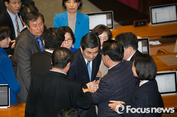 (서울=포커스뉴스) 테러방지법 직권상정에 반발해 야당이 세계 최장 기록의 필리버스터(무제한 토론)를 진행한 2일 오후 서울 여의도 국회 본회의장에서 마지막 주자인 이종걸 더불어민주당 원내대표가 토론을 마친 뒤 동료 의원들의 격려를 받으며 퇴장하고 있다. 마지막 주자로 나선 이 원내대표는 이날 정청래 의원의 기록인 11시간 40분을 경신한 12시간 31분을 기록하며 토론을 마쳤으며, 야당의 필리버스터는 약 193시간만에 종료됐다.