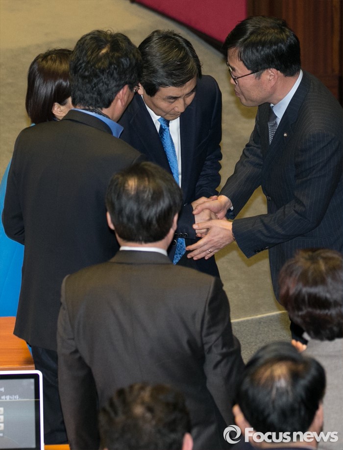 (서울=포커스뉴스) 테러방지법 직권상정에 반발해 야당이 세계 최장 기록의 필리버스터(무제한 토론)를 진행한 2일 오후 서울 여의도 국회 본회의장에서 마지막 주자인 이종걸 더불어민주당 원내대표가 토론을 마친 뒤 동료 의원들의 격려를 받으며 퇴장하고 있다. 마지막 주자로 나선 이 원내대표는 이날 정청래 의원의 기록인 11시간 40분을 경신한 12시간 31분을 기록하며 토론을 마쳤으며, 야당의 필리버스터는 약 193시간만에 종료됐다.