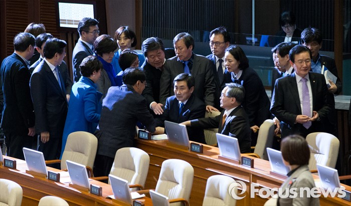 (서울=포커스뉴스) 테러방지법 직권상정에 반발해 야당이 세계 최장 기록의 필리버스터(무제한 토론)를 진행한 2일 오후 서울 여의도 국회 본회의장에서 마지막 주자인 이종걸 더불어민주당 원내대표가 토론을 마친 뒤 동료 의원들의 격려를 받으며 퇴장하고 있다. 마지막 주자로 나선 이 원내대표는 이날 정청래 의원의 기록인 11시간 40분을 경신한 12시간 31분을 기록하며 토론을 마쳤으며, 야당의 필리버스터는 약 193시간만에 종료됐다.