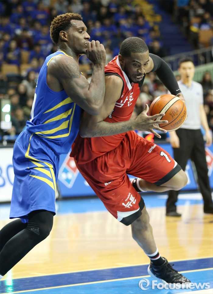 (서울=포커스뉴스) 2일 서울 잠실실내체육관에서 열린 2015-2016 프로농구 삼성-KGC 6강플레이오프 4차전에서 KGC 찰스 로드가 삼성 라틀리프와 몸싸움을 하며 골밑으로 대시하고 있다.