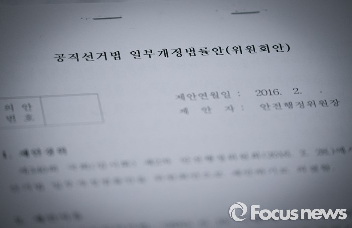 (서울=포커스뉴스) 2일 오후 서울 여의도 국회에서 열린 법제사법위원회 전체회의에 공직선거법 개정안 자료가 보이고 있다. 이날 법사위는 20대 총선 선거구 획정안을 담은 공직선거법 개정안 등을 의결했다.