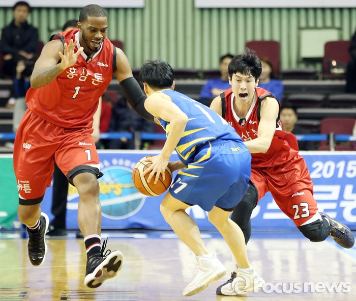 (서울=포커스뉴스) 2일 서울 잠실실내체육관에서 열린 2015-2016 프로농구 삼성-KGC 6강플레이오프 4차전에서 KGC 찰스 로드와 전성현이 삼성 이시준을 강하게 압박수비를 하고 있다.