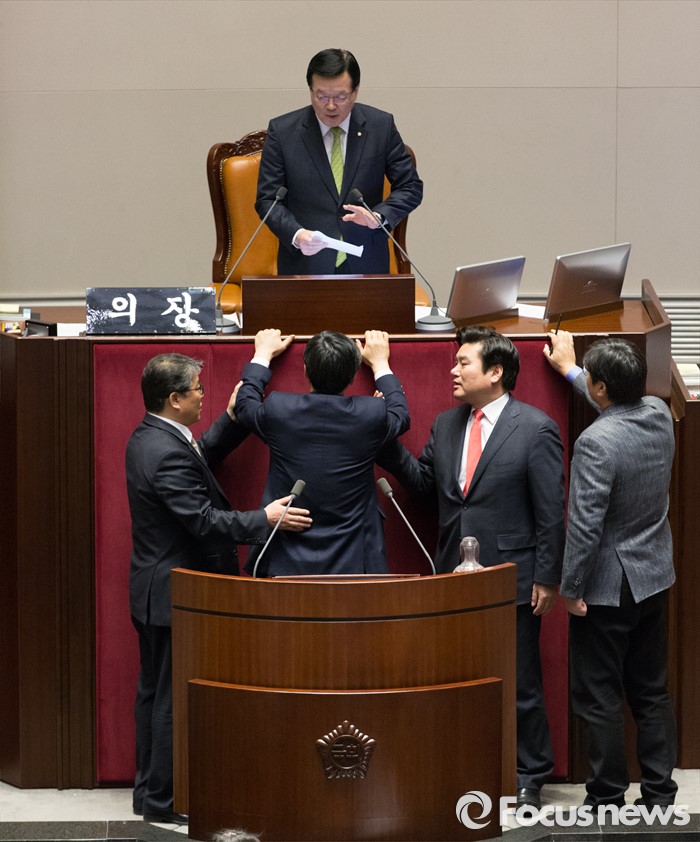 (서울=포커스뉴스) 2일 오후 서울 여의도 국회에서 열린 340회 국회(임시회) 7차 본회의에 참석한 이종걸 더불어민주당 원내대표, 이춘석 원내수석부대표가 정의화 국회의장의 모두발언에 항의하자 원유철 새누리당 원내대표, 조원진 원내수석부대표가 말리고 있다.