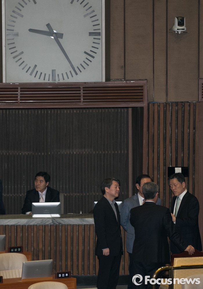 (서울=포커스뉴스) 2일 오후 서울 여의도 국회에서 열린 340회 국회(임시회) 7차 본회의에 참석한 안철수 국민의당 상임공동대표와 의원들이 대화하고 있다.