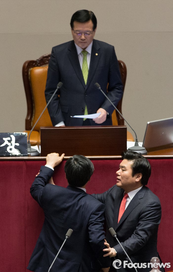 (서울=포커스뉴스) 2일 오후 서울 여의도 국회에서 열린 340회 국회(임시회) 7차 본회의에 참석한 이종걸 더불어민주당 원내대표, 이춘석 원내수석부대표가 정의화 국회의장의 모두발언에 항의하자 원유철 새누리당 원내대표가 말리고 있다.