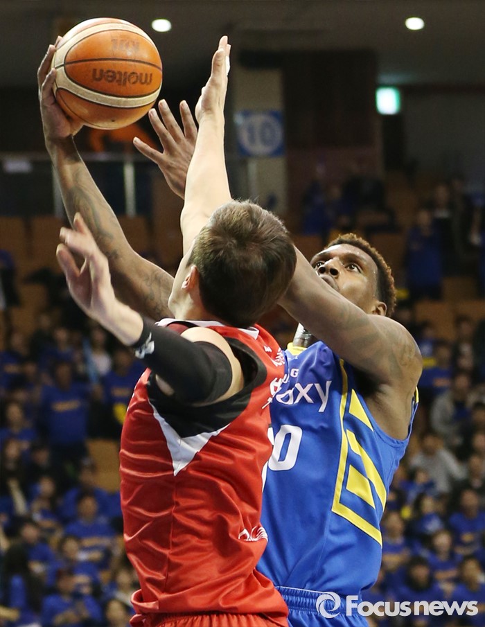 (서울=포커스뉴스) 2일 서울 잠실실내체육관에서 열린 2015-2016 프로농구 삼성-KGC 6강플레이오프 4차전에서 삼성 라틀리프가 KGC 박찬희의 마크를 피해 레이업슛을 쏘고 있다.