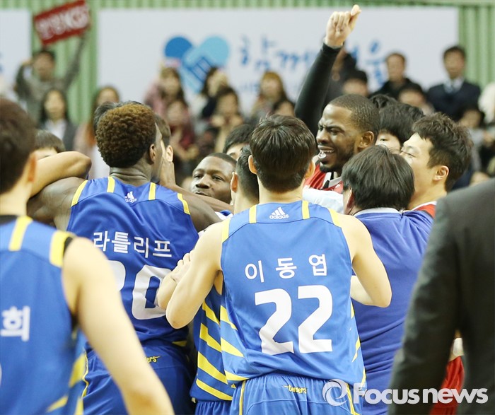 (서울=포커스뉴스) 2일 서울 잠실실내체육관에서 열린 2015-2016 프로농구 삼성-KGC 6강플레이오프 4차전에서 경기를 마친후 삼성과 KGC 선수들이 몸싸움을 하고 있다.