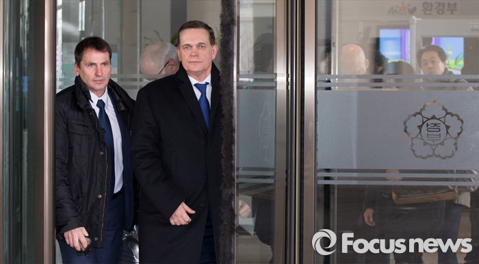 한편 검찰은 디젤차량 배출가스를 조작하고 정부의 리콜 명령을 이행하지 않은 혐의로 아우디폭스바겐코리아를 수사 중이다.(세종=포커스뉴스) 요하네스 타머(오른쪽) 아우디폭스바겐코리아 사장과 프리드리히 요한 아이히러 독일 폭스바겐 파워트레인 총괄책임자 등 독일본사 직원들이 19일 오전 세종시 정부세종청사 환경부 교통환경과에서 결함시정 관련 기술적 내용을 설명하고 환경부를 나서고 있다. 환경부는 결함시정계획서의 핵심내용을 제출하지 않은 요하네스 타머 아우디폭스바겐코리아 사장을 오후 서울지방지검에 형사 고발할 계획이다. 2016.01.19 김기태 기자