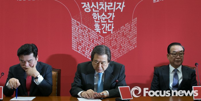 (서울=포커스뉴스) 김무성(가운데) 새누리당 대표와 원유철(왼쪽) 원내대표, 서청원 최고위원이 3일 오전 서울 여의도 국회에서 열린 최고위원회의에 참석해 생각에 잠겨 있다.
