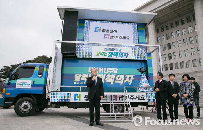 (서울=포커스뉴스) 김종인 더불어민주당 비대위 대표가 3일 오전 서울 여의도 국회 앞에서 열린 달리는 정책의자 발대식에 참석해 인사말을 하고 있다.