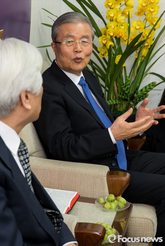 (서울=포커스뉴스) 3일 오전 서울 종로구 한국기독교회관을 방문한 김종인(오른쪽) 더불어민주당 비상대책위원회 대표가 김영주 한국기독교교회협의회 총무를 만나 대화하고 있다.