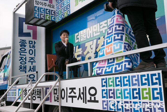 (서울=포커스뉴스) 김병관 더불어민주당 비대위원이 3일 오전 서울 여의도 국회 앞에서 열린 달리는 정책의자 발대식에 참석해 홍보영상을 촬영하고 있다.