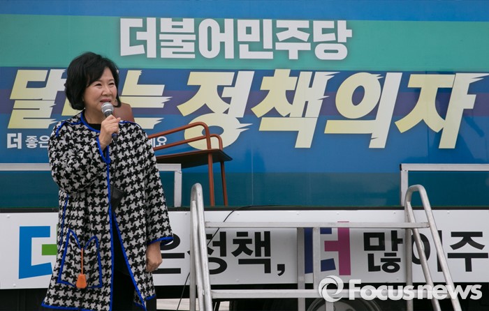 (서울=포커스뉴스) 손혜원 더불어민주당 홍보위원장이 3일 오전 서울 여의도 국회 앞에서 열린 달리는 정책의자 발대식에 참석해 인사말을 하고 있다.