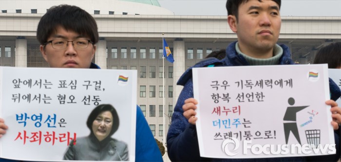 (서울=포커스뉴스) 3일 오전 서울 여의도 국회 앞에서 성소수자차별반대 무지개행동을 비롯한 인권시민사회단체가 성소수자 혐오, 차별에 동조하는 새누리당 김무성 대표와 더불어민주당 박영선 비대위원을 규탄하는 기자회견을 하고 있다.
