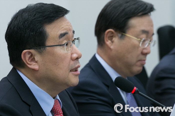 (서울=포커스뉴스) 김정훈(왼쪽) 새누리당 정책위의장이 3일 오전 서울 여의도 국회에서 총선공약 배려나누기 기자간담회에 참석해 인사말을 하고 있다.