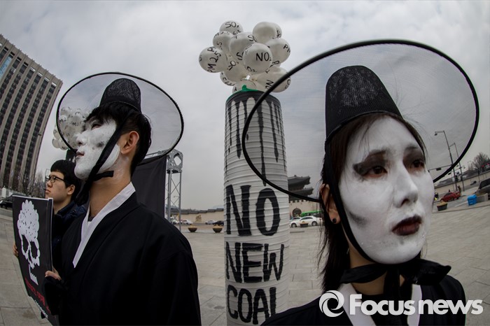 (서울=포커스뉴스) 3일 오전 서울 종로구 광화문 광장에서 그린피스 회원들이 충남지역 신규 석탄화력발전소 허가 취소를 촉구하는 퍼포먼스를 펼치고 있다.