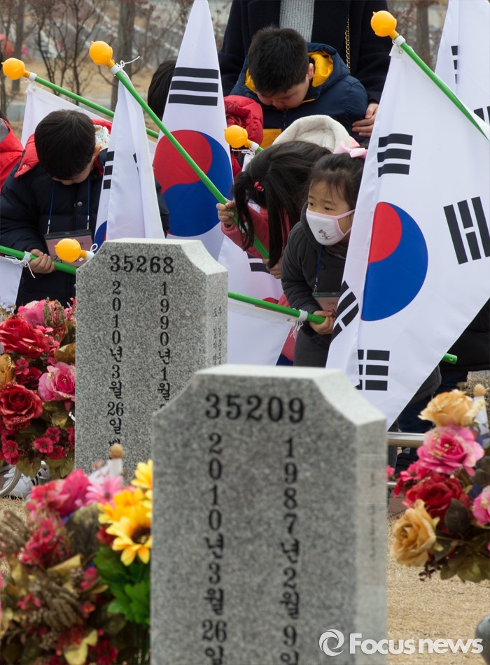 (대전=포커스뉴스) 3일 오전 입학 후 첫 수업에 들어간 대전 화정초등학교 1학년 신입생들이 대전 유성구 국립대전현충원 천안함 46용사 묘역을 찾아 참배하고 있다.