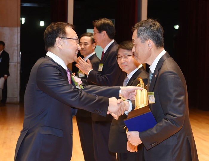 (서울=포커스뉴스) 유일호 부총리 겸 기획재정부 장관이 3일 서울 강남구 코엑스에서 열린 '제50회 납세자의 날'행사 에 참석, 에스케이하이닉스(주)에 국세 칠천억원 탑을 수여하고 있다. <사진제공=기획재정부>