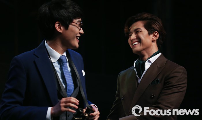 (서울=포커스뉴스) 3일 오후 서울 종로구 대명문화공장에서 열린 뮤지컬 '쓰릴 미' 프레스콜 행사에 참석한 배우 정동화(왼쪽)와 정욱진이 주요장면을 시연하고 있다.