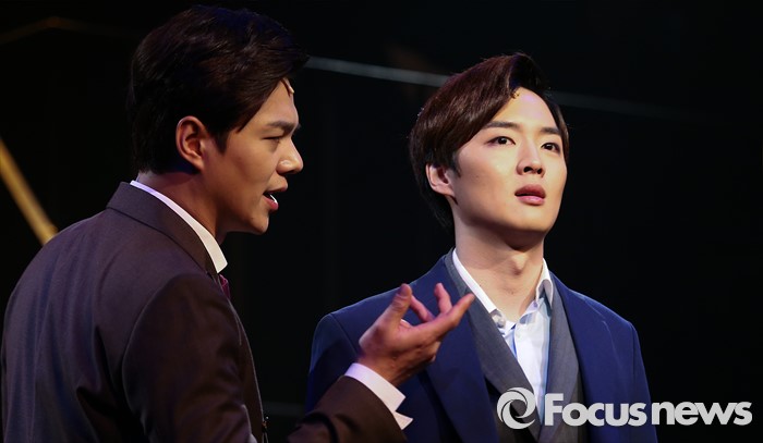 (서울=포커스뉴스) 3일 오후 서울 종로구 대명문화공장에서 열린 뮤지컬 '쓰릴 미' 프레스콜 행사에 참석한 배우 임병근(왼쪽)과 강영석이 주요장면을 시연하고 있다.