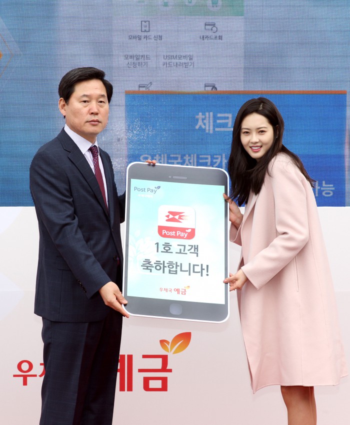 한편, 우체국 금융은 정부기업으로 약 50% 이상이 읍·면 등 농어촌에 소재하고 있어 농어촌, 도서벽지까지 금융서비스를 제공하고 있다. 현재 우체국스마트뱅킹에 가입한 농어촌 가입자는 33만명에 이르고 점차 증가 추세에 있다.김기덕 우본 본부장(왼쪽)과 '우체국 페이' 1호 가입자인 우체국금융모델 탤런트 고아라씨가 기념촬영을 하고 있다.<사진제공=우본>