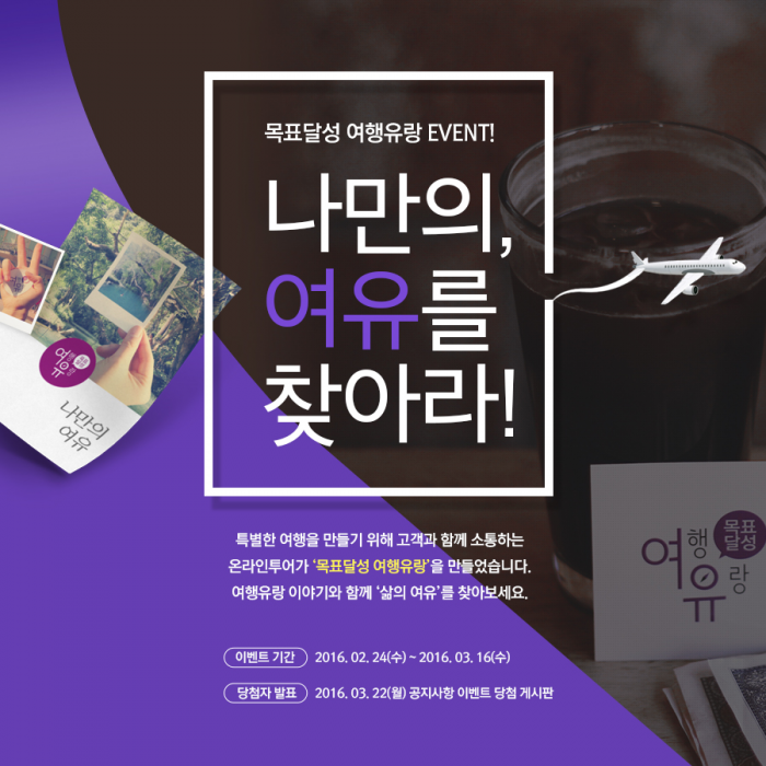 (서울=포커스뉴스) 온라인투어는 고객과 함께 하는 '목표달성 여행유랑 이벤트-나만의 여유를 찾아라'를 오픈했다고 3일 밝혔다.