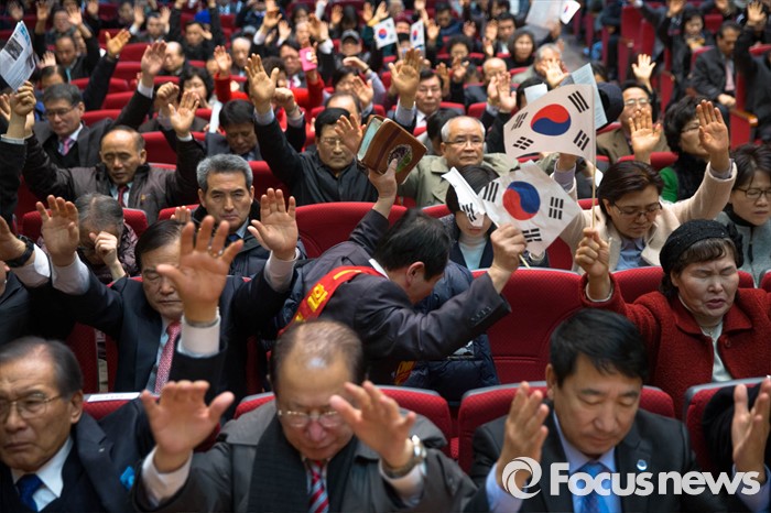 (서울=포커스뉴스) 3일 오후 서울 종로 한국기독교100주년 기념관에서 열린 기독자유당 창당대회에서 참가자들이 기도를 하고 있다.